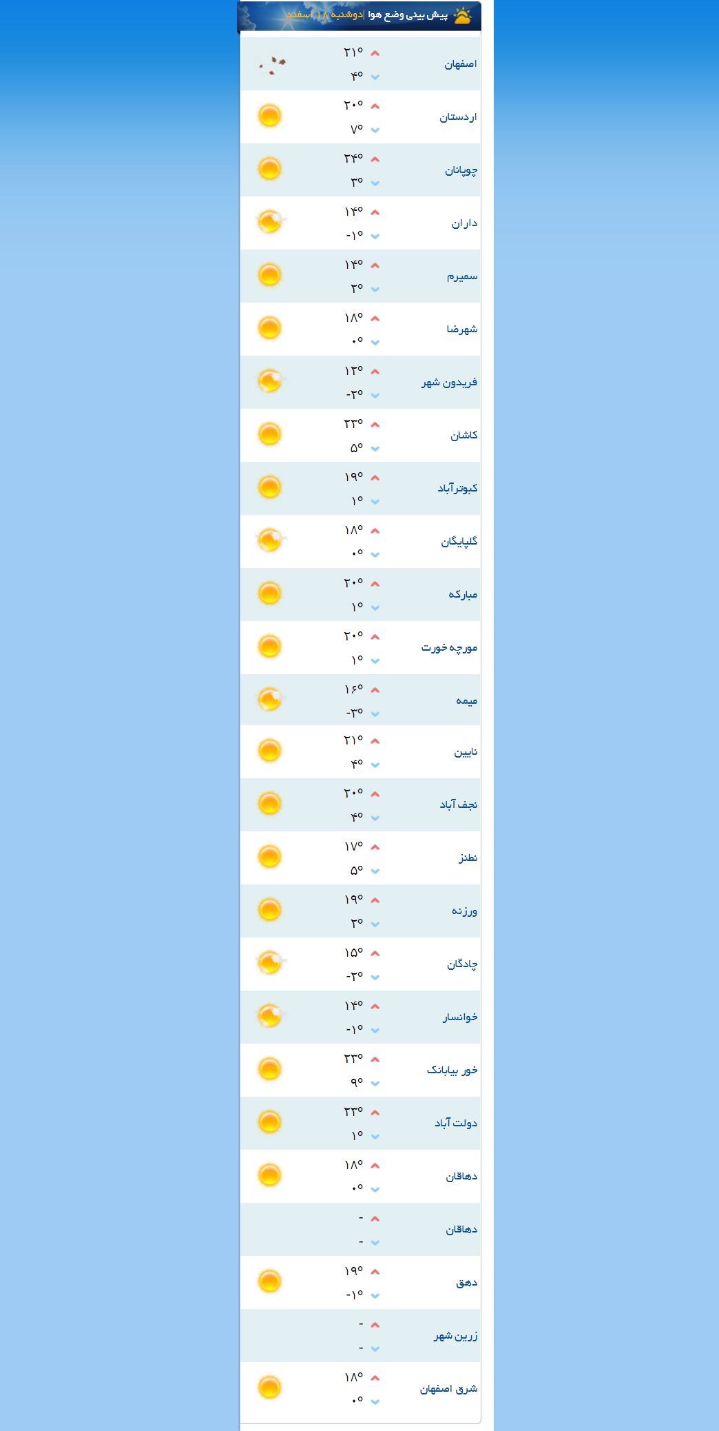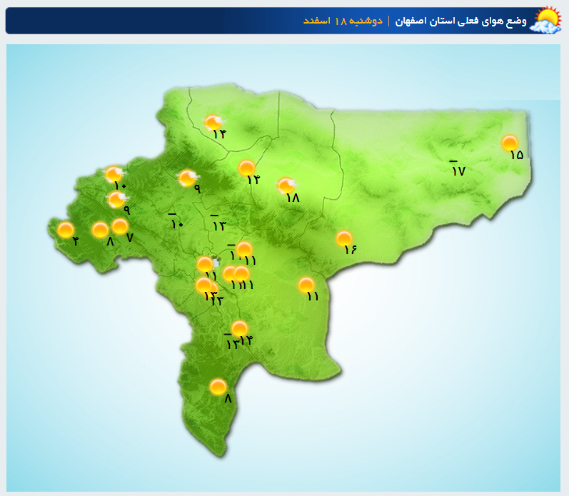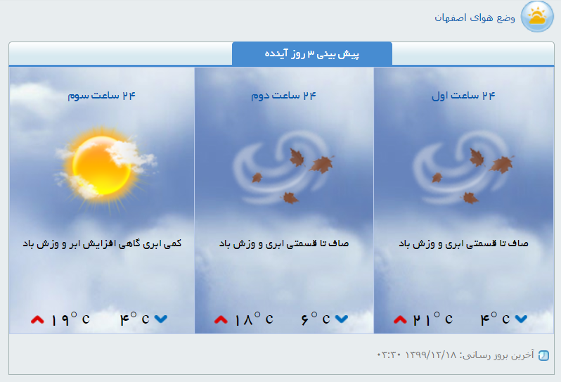 اصفهان- ایرنا- اداره کل هواشناسی اصفهان روز دوشنبه برای اواخر هفته جاری این استان افزایش ابر ، وزش باد و بارش باران پیش بینی کرد.