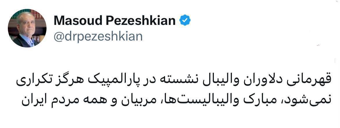 مسعود پزشکیان، رئیس جمهور در پیامی پیروزی والیبال نشسته ایران در مسابقات پارلمپیک ۲۰۲۴ پاریس را تبریک گفت.