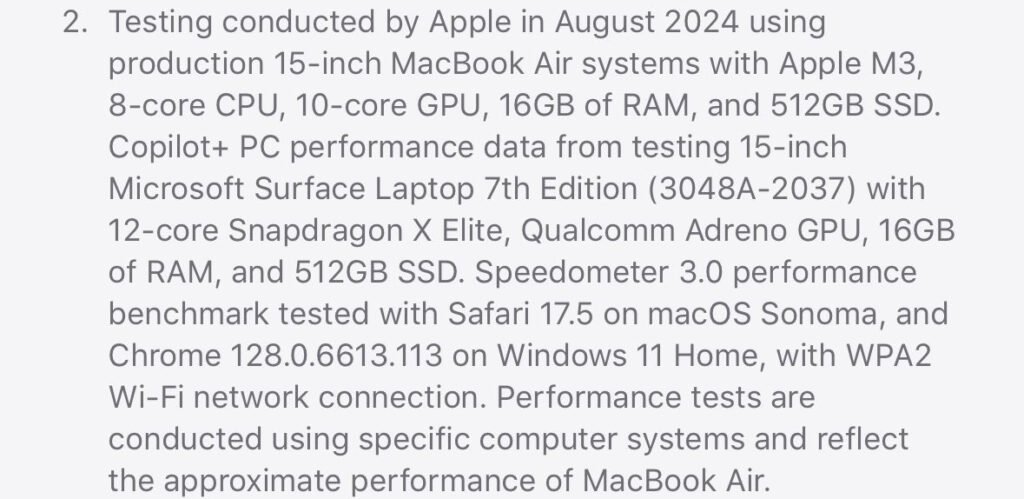 در توضیحات اپل آمده است این تستها ماه گذشته انجام شده و مکبوک ایر M3 با لپتاپ سرفیس مایکروسافت نسخه هفتم مقایسه شده است. بهعبارت دقیقتر این تستها در آگوست 2024 با استفاده از مکبوک ایر 15 اینچی M3 با 8 هستهای پردازشی و 10 هسته گرافیکی، 16 گیگابایت رم و 512 گیگابایت حافظه SSD انجام شد. اپل همچنین از لپتاپ 15 اینچی Microsoft Surface نسل هفتم با اسنپدراگون ایکس الیت 12 هستهای، پردازشگر گرافیکی آدرنو، 16 گیگابایت رم و 512 گیگابایت SSD در این مقایسه استفاده کرده است.