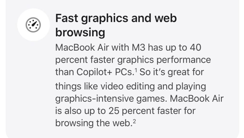 «مکبوک ایر M3 تا 40 درصد عملکرد گرافیکی سریعتری نسبت به رایانههای شخصی +Copilot دارد؛ بنابراین برای مواردی مانند ویرایش ویدیو و اجرای بازیهای گرافیکی بسیار عالی است. همچنین مکبوک ایر در وبگردی تا 25 درصد سریعتر است.»