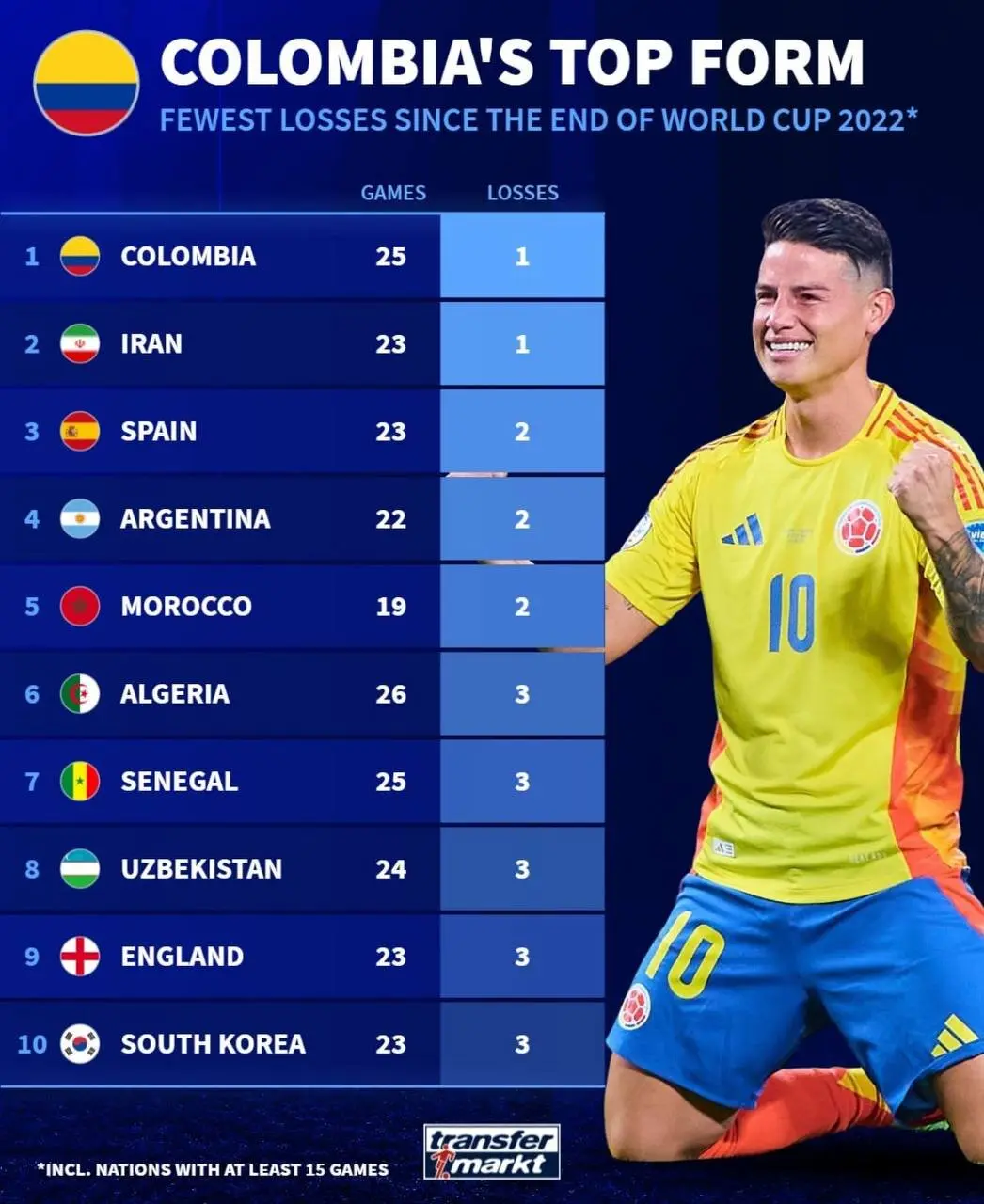 تیم ملی ایران با تنها یک شکست در ۲۳ بازی خود بعد از جام جهانی ۲۰۲۲، پس از کلمبیا در رده دوم جدول کمترین تعداد باخت قرار گرفت.