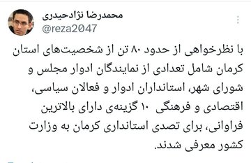 “با نظرخواهی از حدود ۸۰ تن از شخصیت های استان کرمان شامل تعدادی از نمایندگان ادوار مجلس و شورای شهر، استانداران ادوار و فعالان سیاسی، اقتصادی و فرهنگی ۱۰ گزینه دارای بالاترین فراوانی، برای تصدی استانداری کرمان به وزارت کشور معرفی شدند. ”