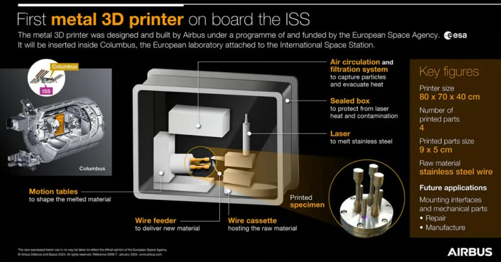 چاپگر سهبعدی فلز مورد استفاده توسط ESA از یک سیم فولادی ضدزنگ استفاده میکند که توسط انرژی لیزر قدرتمندی که به دمای 1200 درجه سانتیگراد میرسد ذوب میشود تا بتواند رشته فلزی مذاب خود را تولید کند. سپس این رشته فلزی لایهبهلایه رسوب میکند تا شکل موردنظر تولید شود.