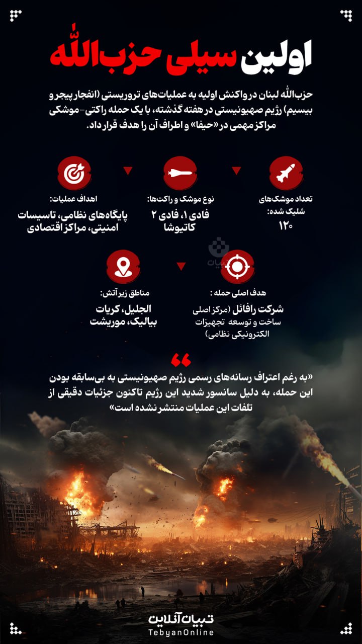 حزبالله لبنان در واکنش اولیه به عملیاتهای تروریستی (انفجار پیجر و بیسیم) رژیم صهیونیستی در هفته گذشته، با یک حمله راکتی-موشکی مراکز مهمی در «حیفا» و اطراف آن را هدف قرار داد.