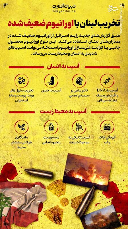 طبق گزارشها رژیم اسرائیل از اورانیوم ضعیف شده در بمبارانهای لبنان استفاده میکند.این نوع اورانیوم محصول جانبی یا فرآیند غنیسازی اورانیوم است که میتواند آسیبهای شدیدی به انسان و محیطزیست میرساند
