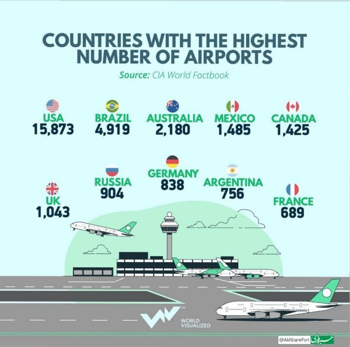 قطعا اولین کشور در لیست کشورهایی با بیشترین فرودگاه در جهان کشور آمریکا خواهد بود. این کشور به دلیل وسعت بسیار زیاد و فاصله زیادی که در بین ایالت ها و شهرهایش وجود دارد، در اول این لیست است. منبع: خبرفوری