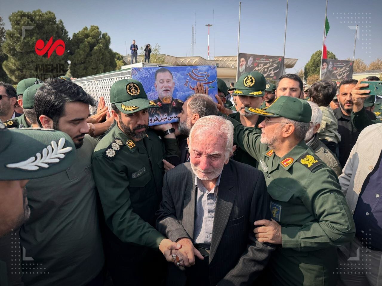 مراسم تشییع پیکر پاک سردار شهید عباس نیلفروشان امروز چهارشنبه ۲۵ مهر ۱۴۰۳ در میدان بسیج مشهد مقدس برگزار میشود. تصویری از گریه های پدر شهید نیلفروشان در کنار تابوت پسر شهیدش را ببینید. منبع: مهر