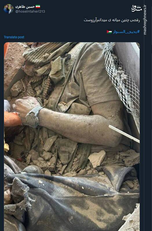 به گزارش مشرق،حسین طاهری با انتشار تصویری از پیکر شهید سنوار در توئیتی نوشت: