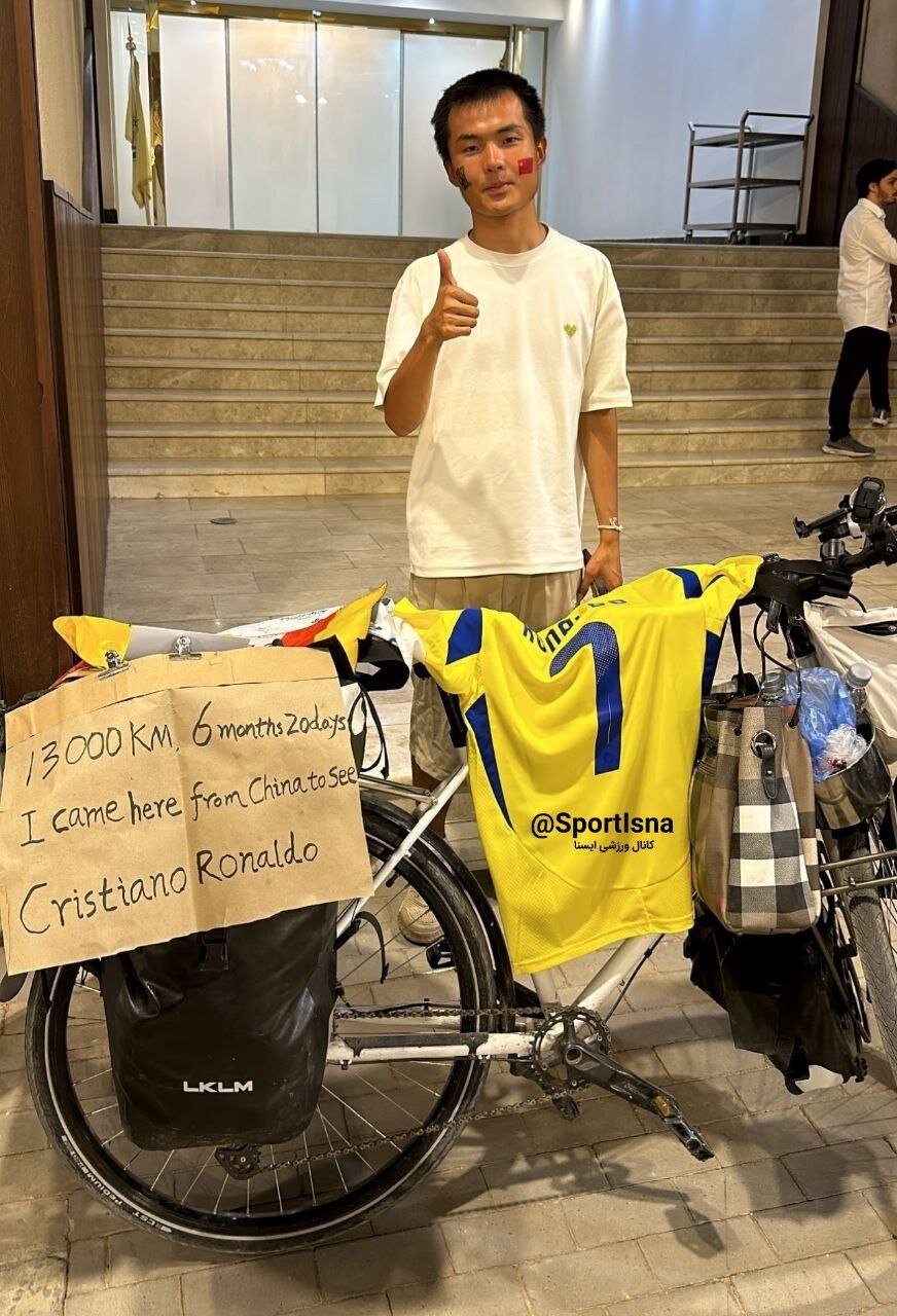 یکی از هواداران چینی کریستیانو رونالدو، مسافت ۱۳ هزار کیلومتری را در ۶ ماه و ۲۰ روز با دوچرخه خود طی کرد و دیروز از کشورش چین وارد ریاض شد و بازدیدی از باشگاه النصر داشت. / چندثانیه
