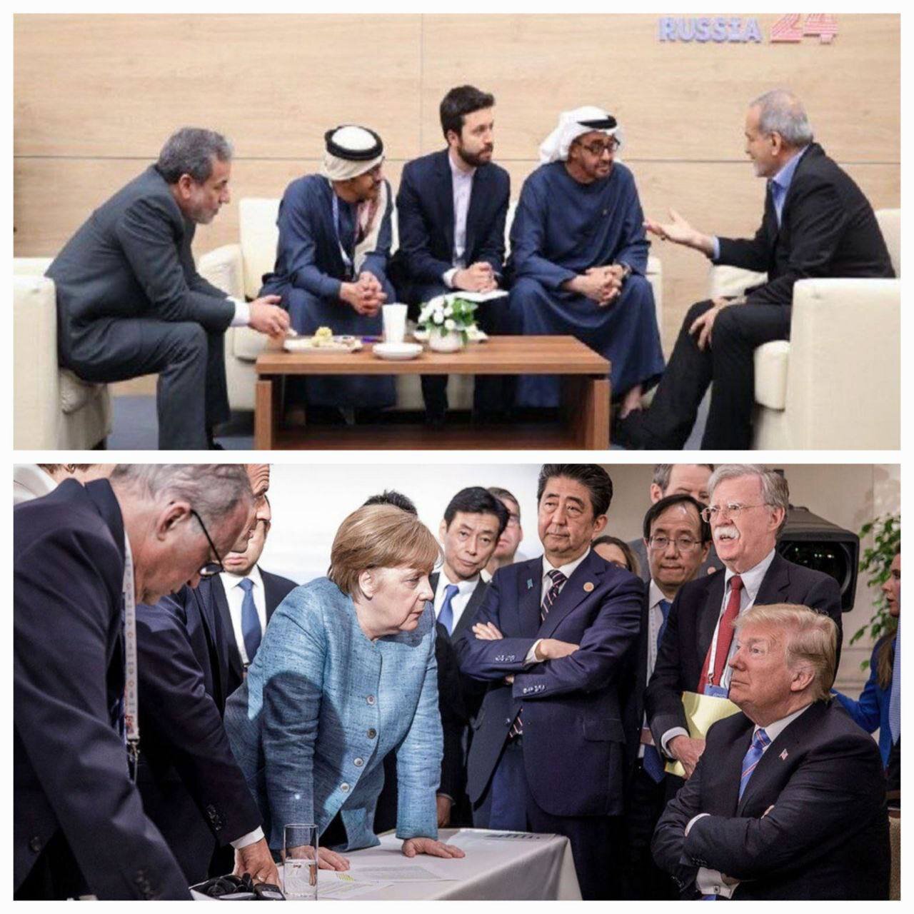 نوع نشستن مقامات ایرانی و اماراتی با تصویری معروف از ترامپ و سران سایر کشورها مقایسه شده است، این تصاویر تشابه سازی شده وایرال شد. منبع: پیام اقتصاد