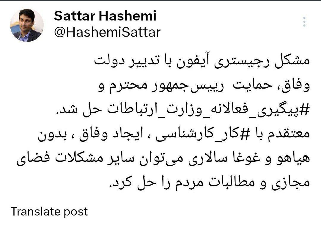 وزیر ارتباطات: مشکل رجیستری آیفون با تدییر دولت وفاق، حمایت رییسجمهور محترم و پیگیری فعالانه وزارت ارتباطات حل شد.
