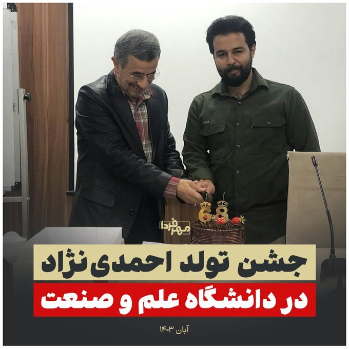 در شصت و هشتمین زادروز محمود احمدی نژاد، جمعی از دانشجویان دانشگاه علم و صنعت ایران برای استاد خود جشن تولد برگزار کردند. / چندثانیه