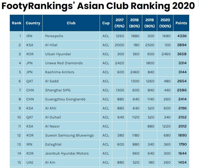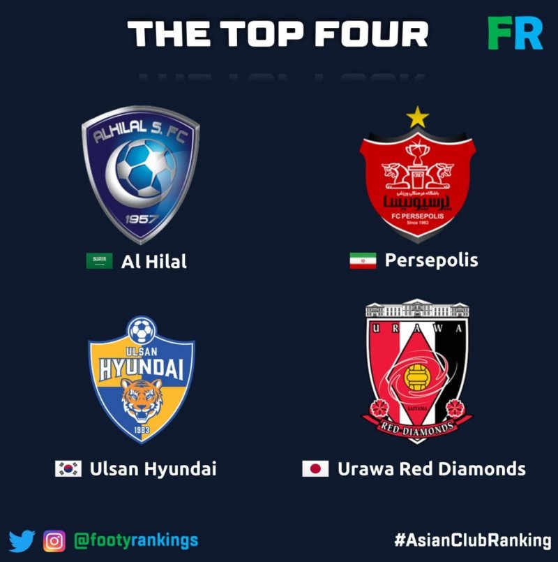 در این رده بندی، الهلال عربستان، اولسان هیوندای و اوراواردز کره جنوبی در رده های دوم تا چهارم قرار گرفتند. استقلال تهران نیز در رتبه سیزدهم جای گرفته است.