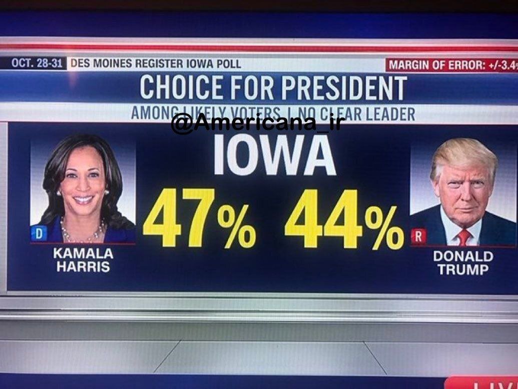 در نظرسنجی جدید ان سلزر، کامالا هریس در ایالت قرمز آیووا ۴۷ به ۴۴ از ترامپ پیش است! آن سلزر سابقه درخشانی در پیشبینی انتخابات در آمریکا دارد و در میان موسسات نظرسنجی نیز از رتبه بالایی برخوردار است. منبع: چندثانیه