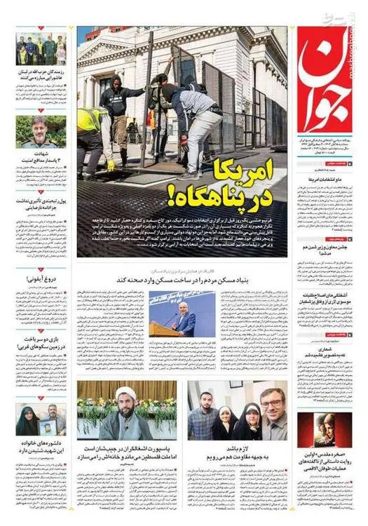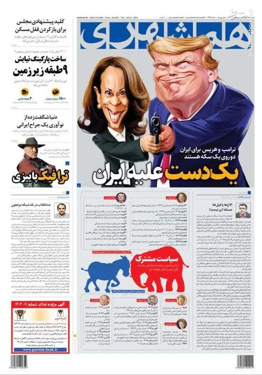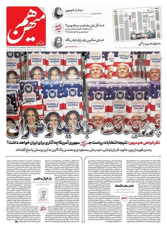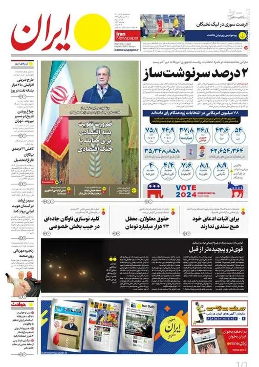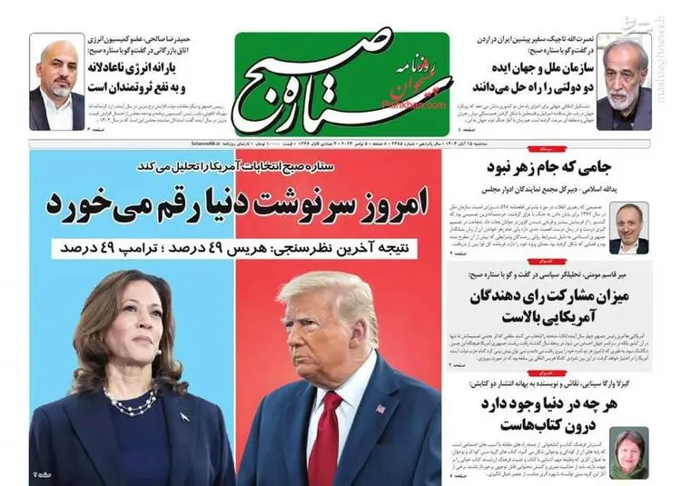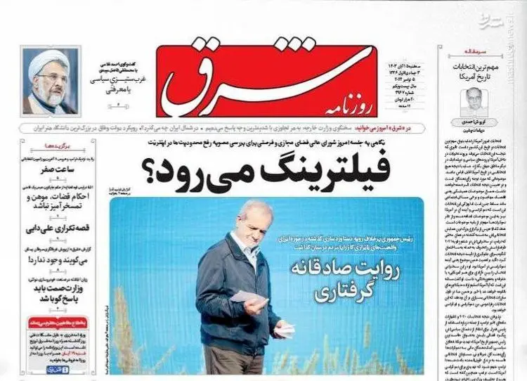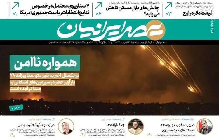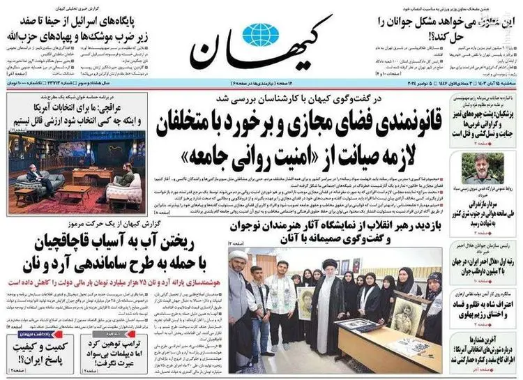 امریکا در پناهگاه!، صیانت از«امنیـت روانی جامعـه» با قانونمندی فضـای مجـازی و برخـورد با متخلفـان، سلام پرشکوه هنر در میدان قبله، ، تیتر برخی از روزنامههای سهشنبه ۱۵ آبان ۱۴۰۳ است.