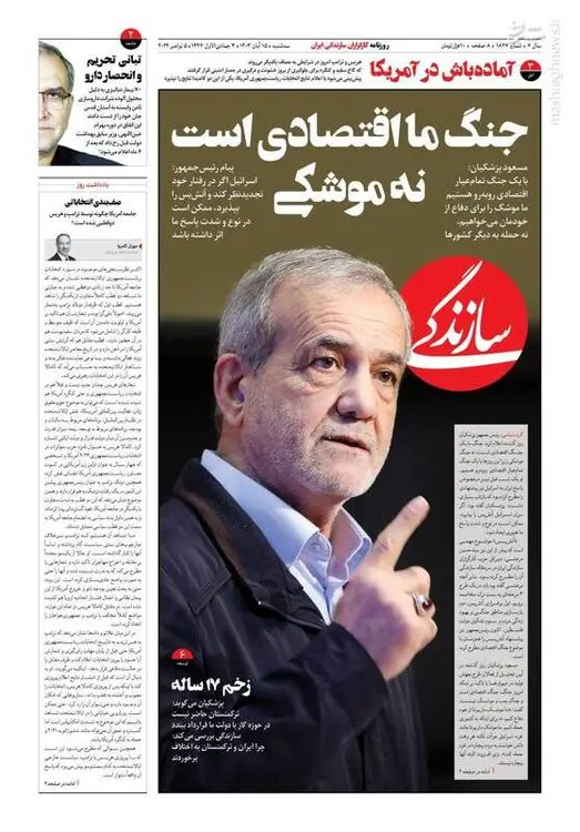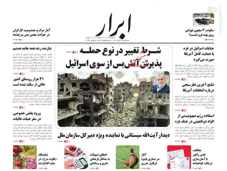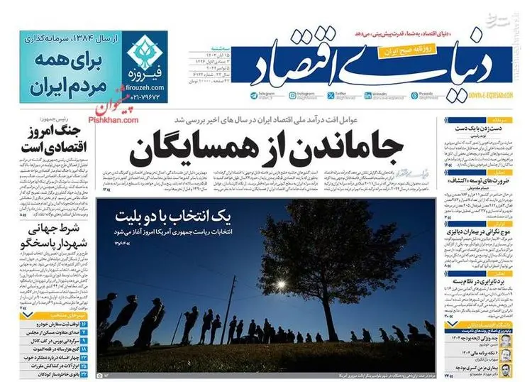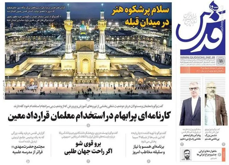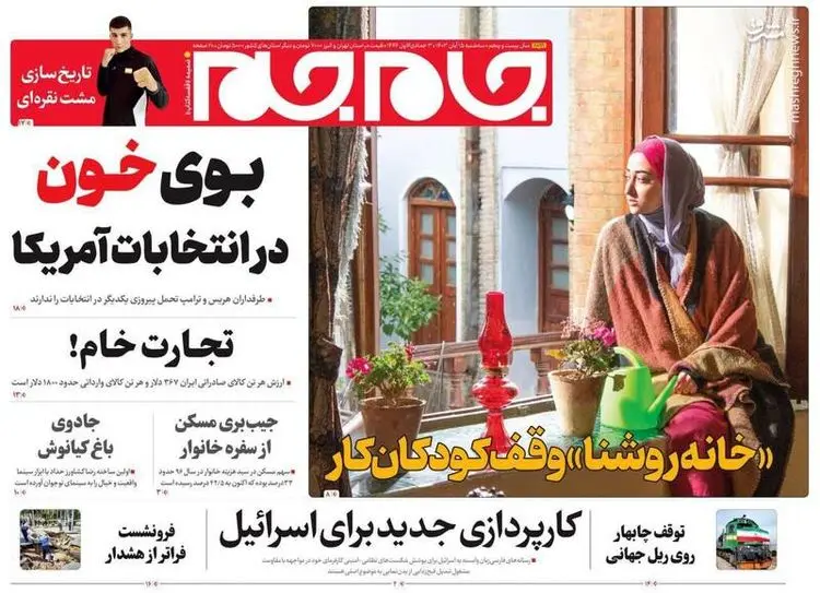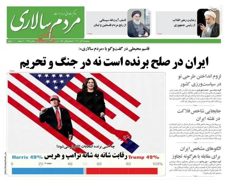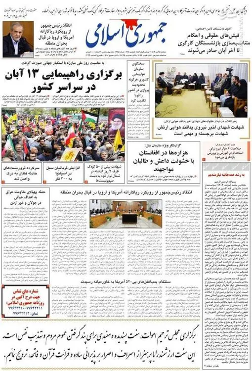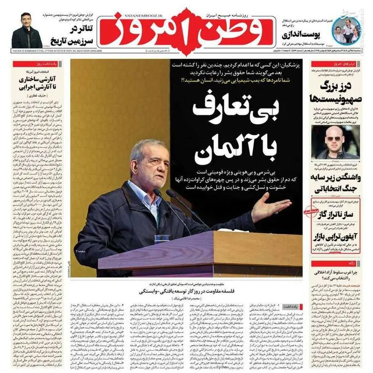 امریکا در پناهگاه!، صیانت از«امنیـت روانی جامعـه» با قانونمندی فضـای مجـازی و برخـورد با متخلفـان، سلام پرشکوه هنر در میدان قبله، ، تیتر برخی از روزنامههای سهشنبه ۱۵ آبان ۱۴۰۳ است.