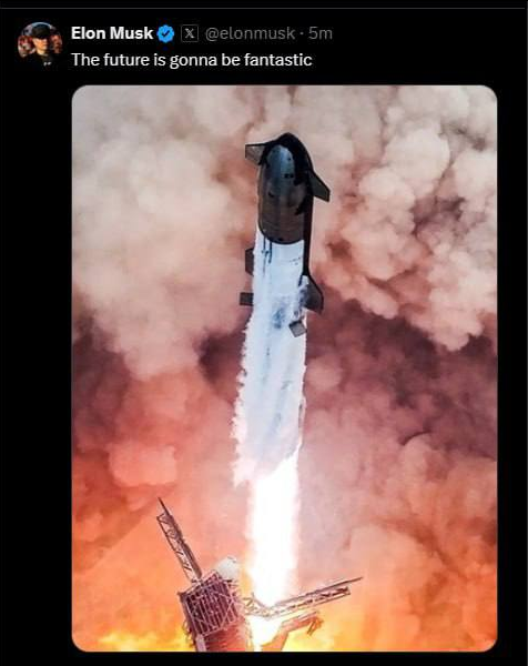 ماسک با انتشار عکسی از لحظه پرتاب موشک استارشیپ به استقبال پیروزی ترامپ رفت و نوشت: آینده فوقالعاده خواهد بود.