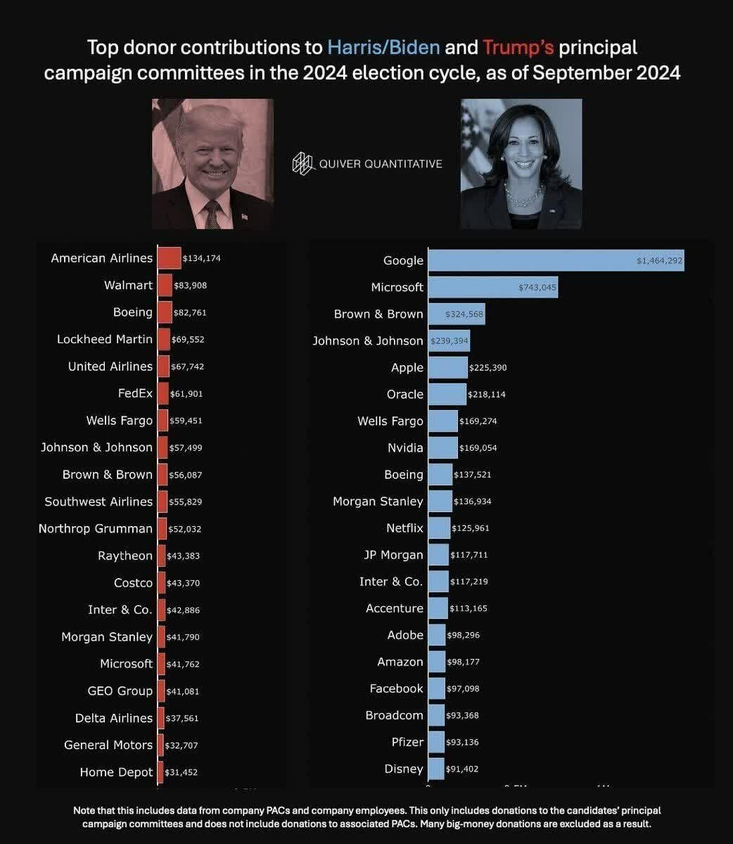 از زمانی که کامالا هریس به عنوان نامزد پیشتاز دموکراتها در انتخابات ریاستجمهوری و سپس نامزد رسمی حزب پس از کنارهگیری رئیسجمهور جو بایدن ظاهر شد، کمکهای مالی برای کمپین او سرازیر شده است. در تصویر زیر حجم پول پاشی و کمک شرکتهای بزرگ و ثروتمند به کمپین هریس را ببینید. منبع: ABC News