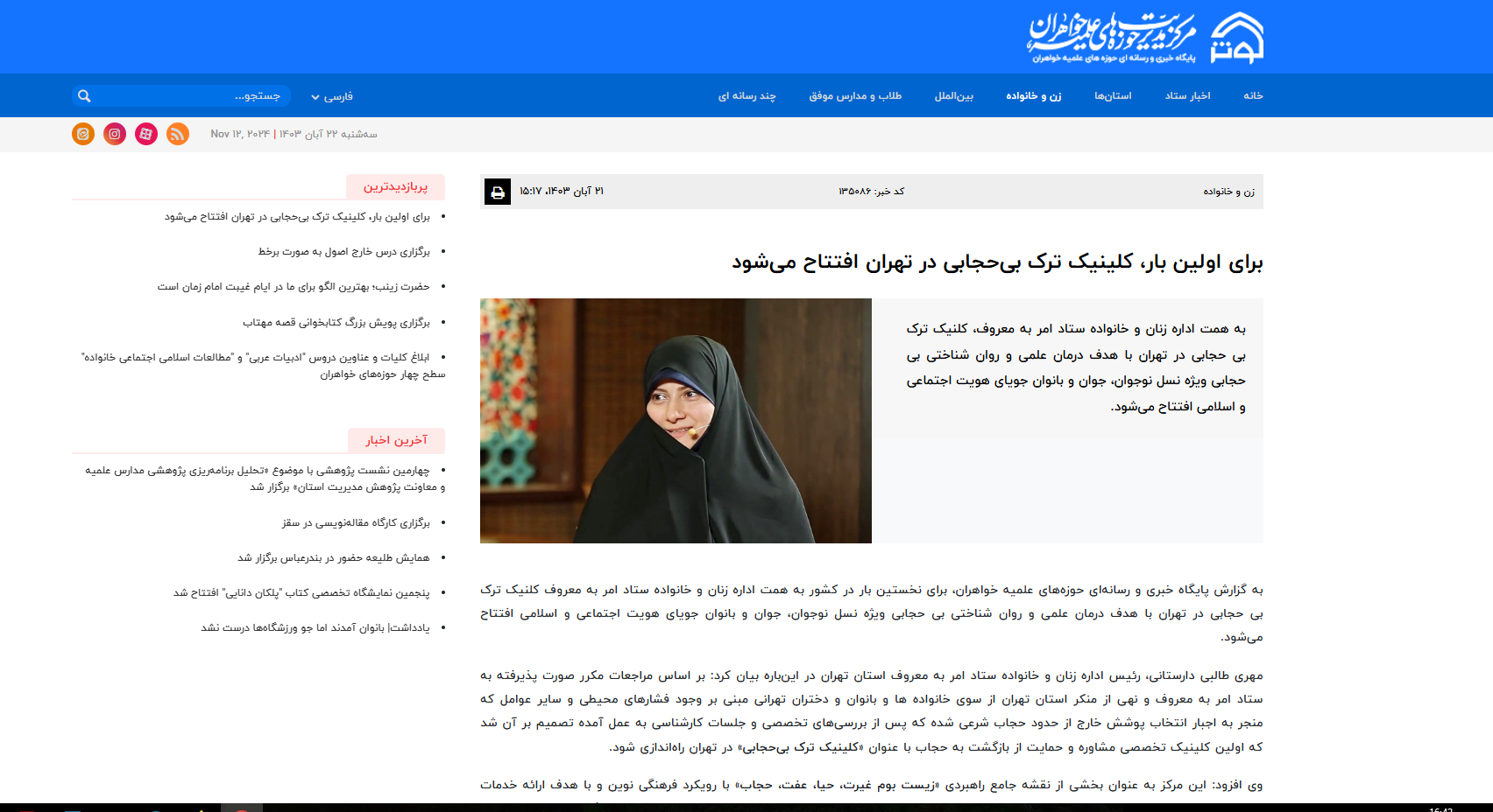 به گزارش الف از پایگاه خبری و رسانهای حوزههای علمیه خواهران، طالبی دارستانی در این باره گفت: برای نخستین بار در کشور به همت اداره زنان و خانواده ستاد امر به معروف، کلینیک ترک بی حجابی در تهران با هدف درمان علمی و روان شناختی بی حجابی ویژه نسل نوجوان، جوان و بانوان جویای هویت اجتماعی و اسلامی افتتاح میشود.