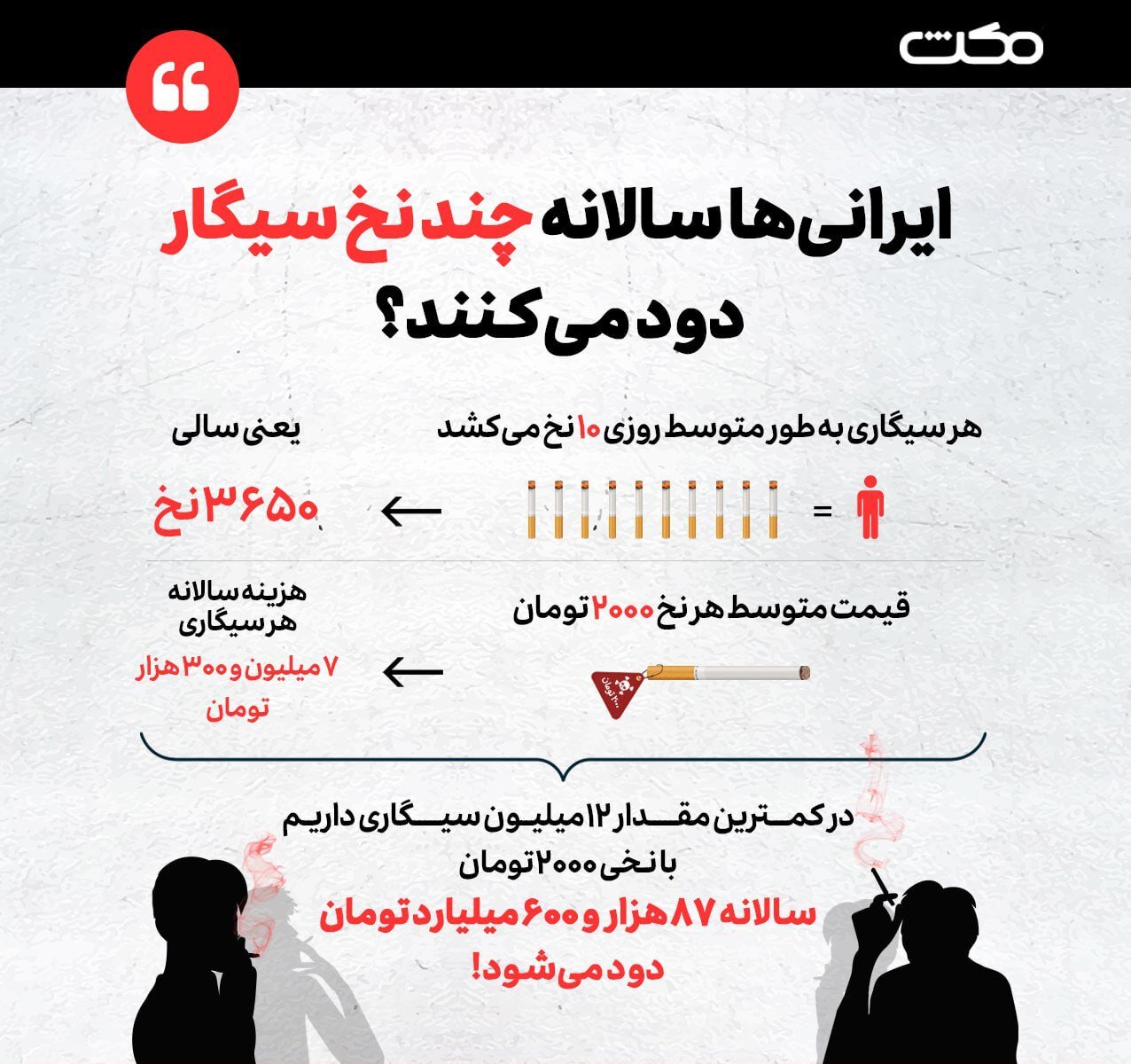هر سیگاری به طور متوسط روزی ۱۰ نخ میکشد، در کمترین مقدار ۱۲ میلیون سیگاری داریم با نخی ۲۰۰۰ تومان ، سالانه ۸۷ هزار و ۶۰۰ میلیارد تومان دود میشود. منبع: آخرین خبر