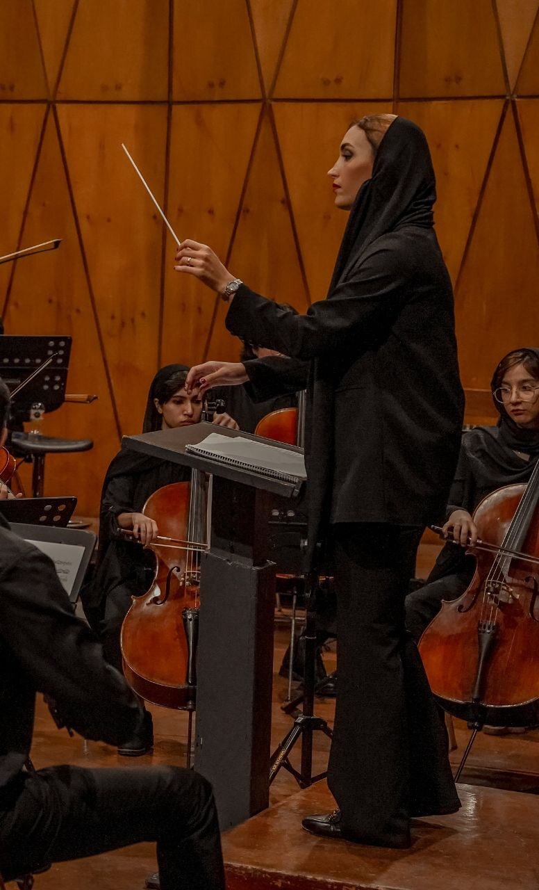 تصویری از شکیبا حسینی که رهبری یک ارکستر را برعهده داشت و مورد توجه شبکههای اجتماعی قرار گرفت. منبع: چندثانیه
