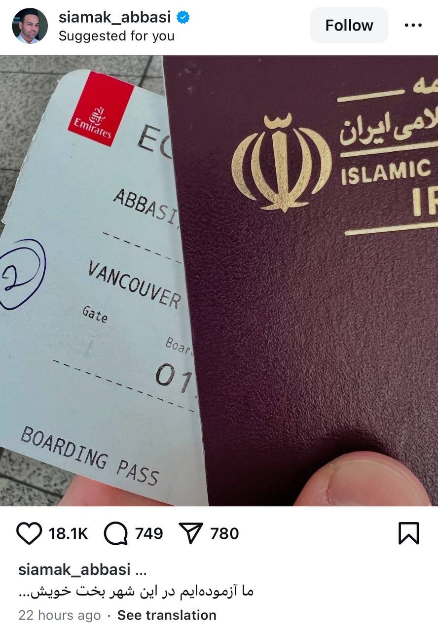 سیامک عباسی خوانده دنیای موسیقی تصویری از گذرنامه خود با بلیت به سمت ونکوور کانادا را منتشر کرد./حاشیه پلاس
