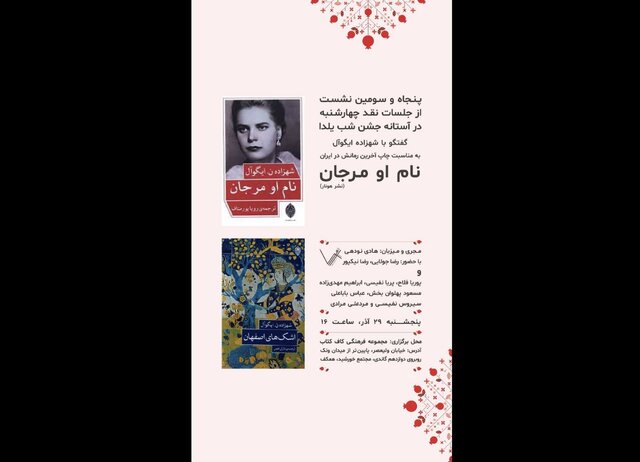 به گزارش ایسنا،سیروس نفیسی، هماهنگکننده برگزاری جلسات «نقد چهارشنبه» گفت: پنجاه و سومین نشست از این سلسله جلسات، به نشست و گفتوگو با شهزاده ایگوآل به مناسبت چاپ آخرین رمانش در ایران با عنوان «نام او مرجان» اختصاص دارد که (پنجشنبه، ۲۹ آذر ماه) از ساعت ۱۶:۰۰ در مجتمع فرهنگی کاف کتاب، با حضور نویسنده، رضا جولایی، رضا نیکپور و جمعی از نویسندگان و منتقدان ادبی برگزار میشود.