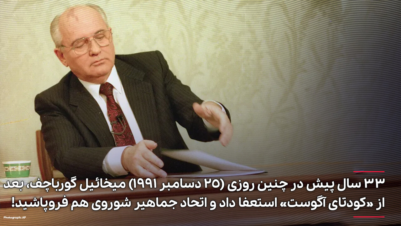 گورباچف متولد ۲ مارس ۱۹۳۱ (بود. او از سال ۱۹۸۵ تا ۱۹۹۱ دبیرکل حزب کمونیست اتحاد جماهیر شوروی بود اما دسامبر ۱۹۹۱ بعد از یک کودتای داخلی موسوم به «کودتای آگوست» سرانجام استعفا داد و اتحاد جماهیر شوروی هم فروپاشید. این تصویر، لحظه امضای استعفای گورباچف را به تصویر کشیده؛ عکسی تاریخی که توسط آسوشیتد پرس ثبت شده است./خبرآنلاین