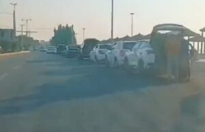 صف انتظار ۱.۵ کیلومتری خودروهای سواری برای ورود به کیش از بندر چارک در سه شنبه ۲۵ دی ماه را مشاهده میکنید.