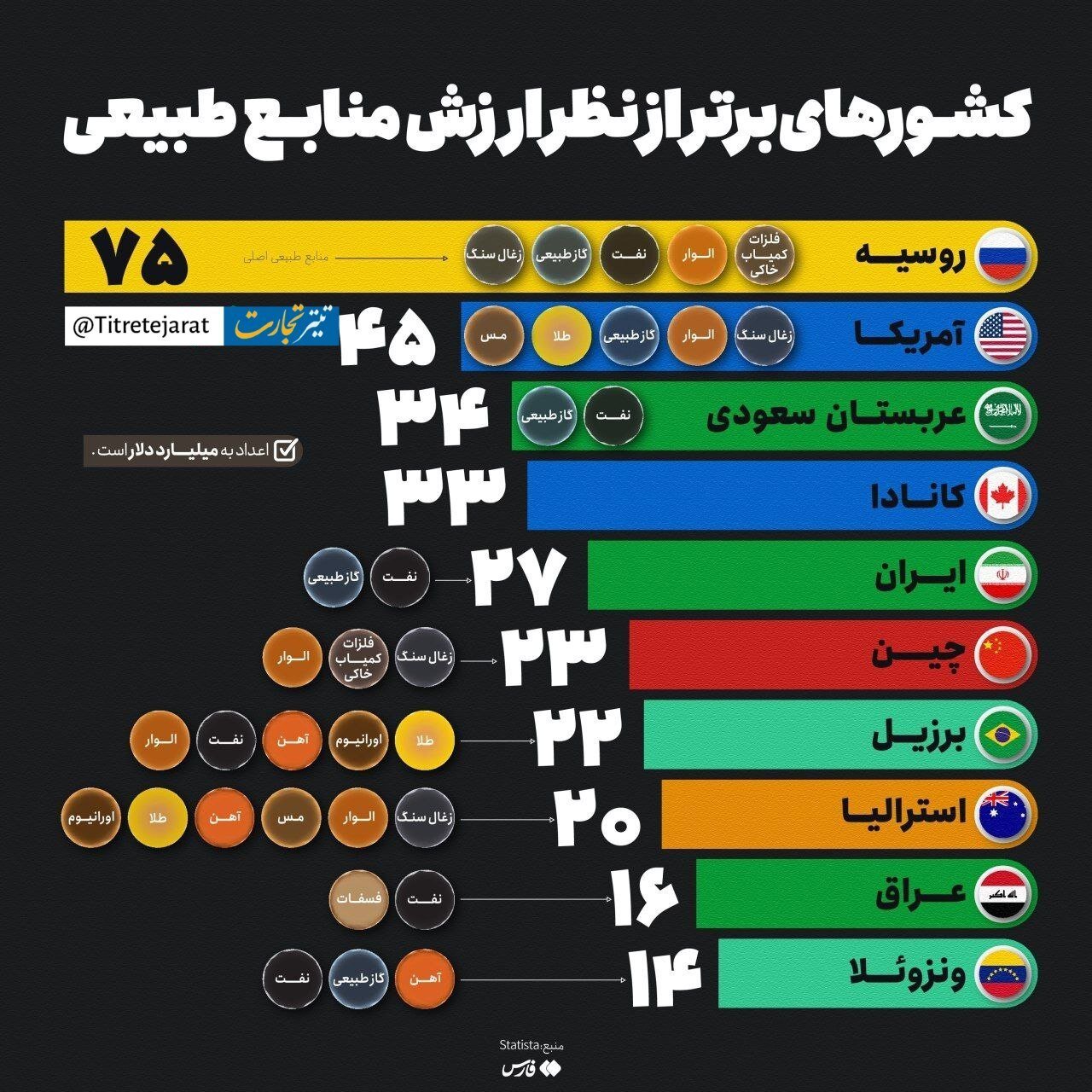 ایران پنجمین کشور جهان از نظر ثروت منابع طبیعی و در زمره ۱۰ اقتصاد اول جهان از نظر ظرفیتهای رشد و توسعه است. منبع: فارس