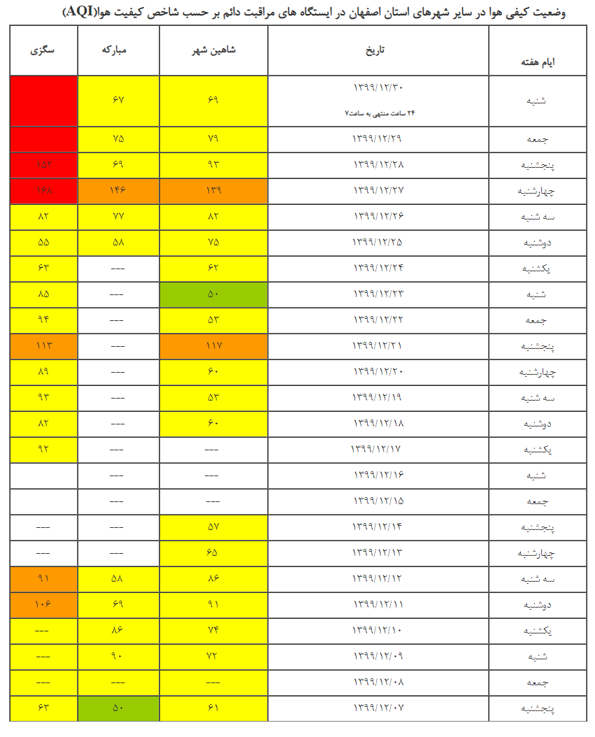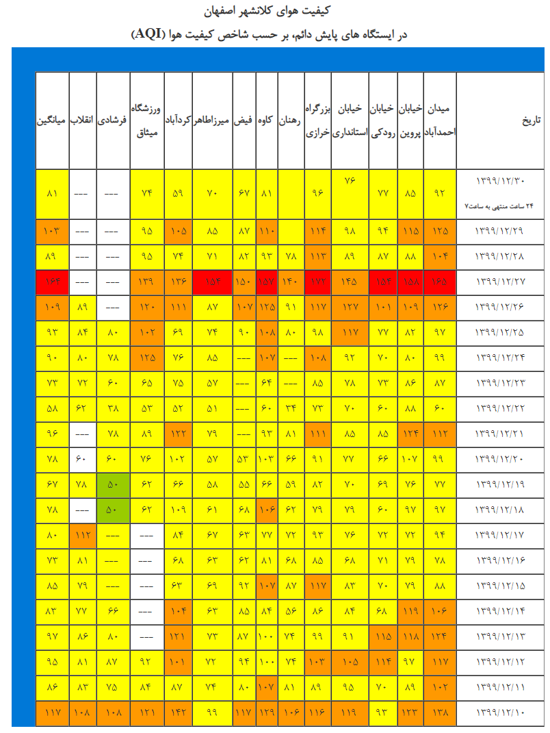 براساس اعلام این مرکز میانگین شاخص کیفیت هوا با ثبت عدد 81 بر مدار زرد و سالم است و وضعیت در ایستگاههای سنجش کیفیت هوا در کلانشهر اصفهان به شرح ذیل است.