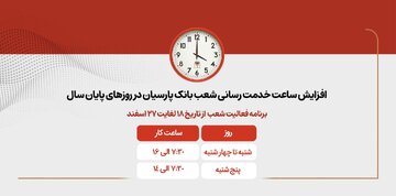 بر این اساس، تمامی شعب بانک پارسیان در تهران و سایر استانها از روز شنبه ۱۸ اسفندماه لغایت روز دوشنبه ۲۷ اسفندماه روزهای شنبه الی چهارشنبه تا ساعت ۱۶ و روزهای پنجشنبه تا ساعت ۱۴ آماده پاسخگویی و ارائه خدمات به مشتریان هستند.