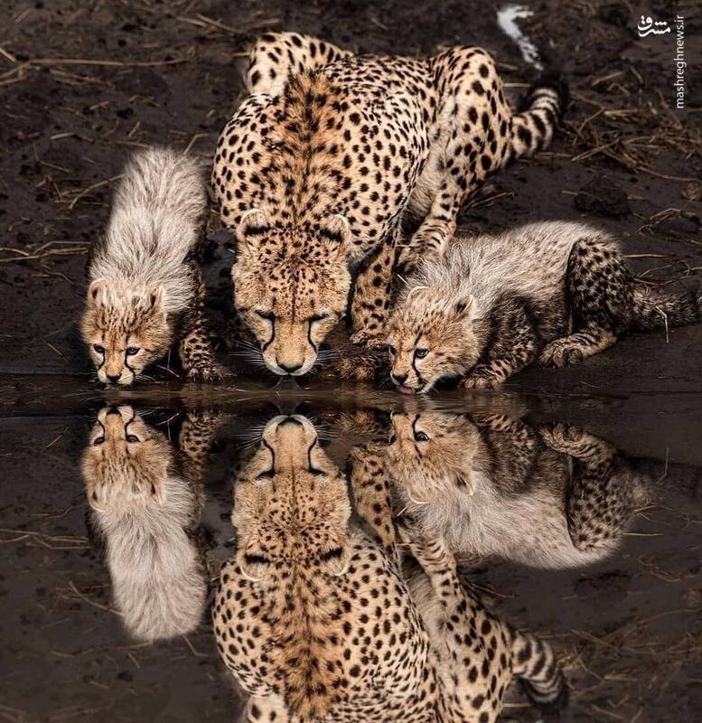 تصویری دیدنی از لحظه آب خوردن خانواده یوزپلنگ ایرانی