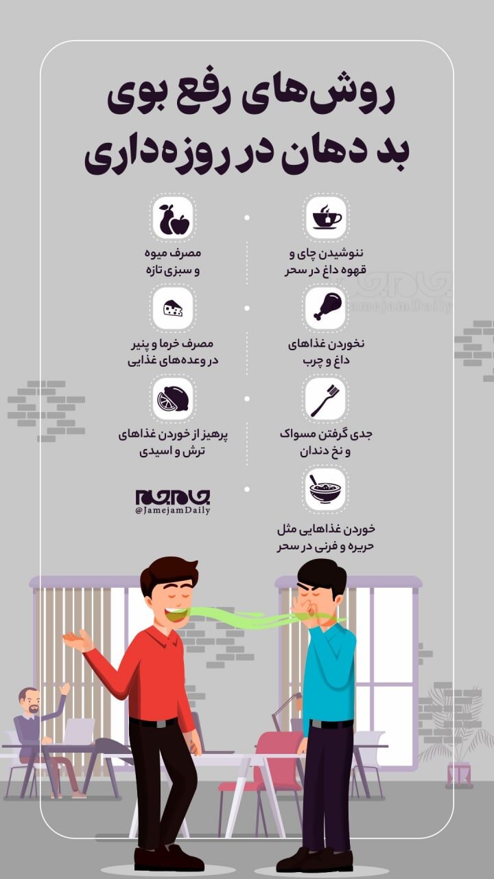 چه کنیم در ماه رمضان دهانمان بو ندهد؟ در این اینفوگرافیک به این سوال شما پاسخ داده شده است. منبع: جامجم