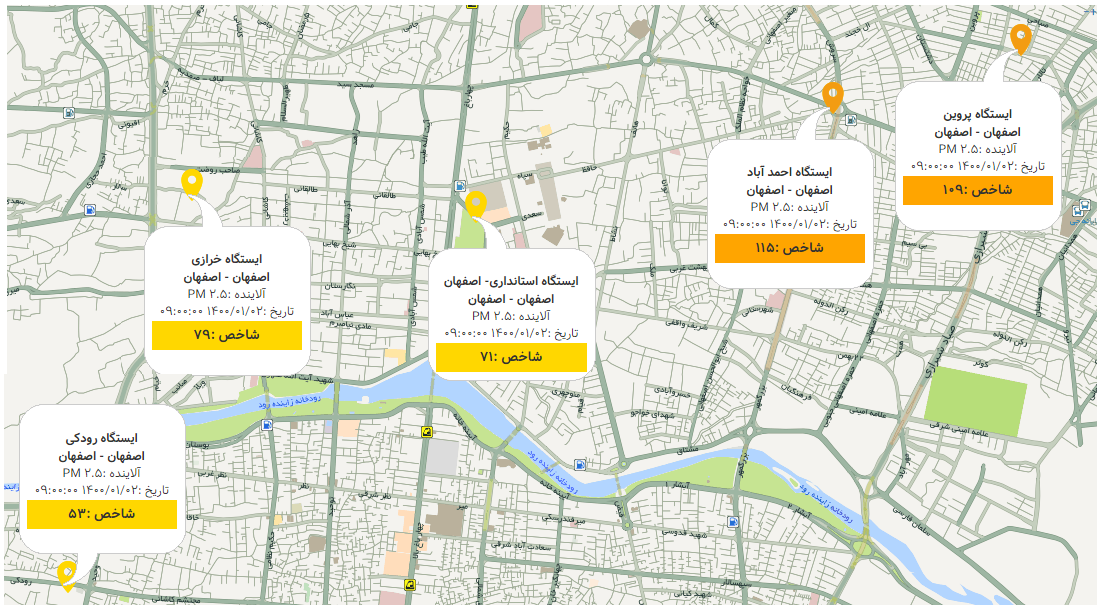 به گزارش ایرنا، میانگین شاخص کیفیت هوا در ایستگاههای خیابان پروین با ۱۰۹ و میدان احمد آباد با ۱۱۵ در وضعیت ناسالم برای گروههای حساس و خیابان استانداری با ۷۱، بزرگراه شهید خرازی با ۷۹ و خیابان رودکی با ۵۳ بر مدار زرد و سالم قرار دارد به این ترتیب غرب کلانشهر اصفهان امروز دارای هوایی سالم و شرق شهر با هوای ناسالم برای گروه های حساس روبه روست.