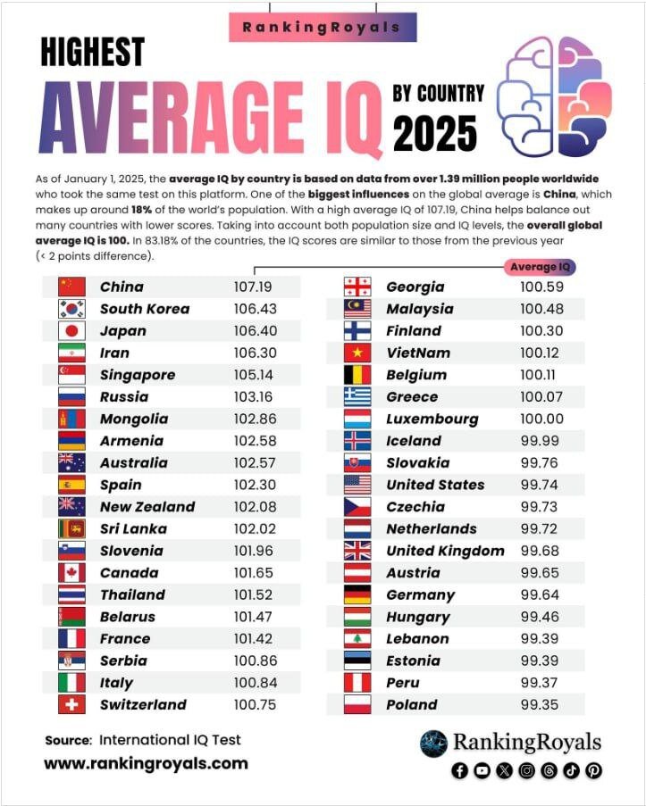در جدیدترین فهرست "میانگین ضریب هوشی" (IQ) در سال ۲۰۲۵، ایرانیها با میانگین ۱۰۶.۳۰ در جایگاه چهارم جهان قرار گرفتند؛ بالاتر از مردم روسیه، آمریکا، کانادا و سوئیس./ Ranking Royals