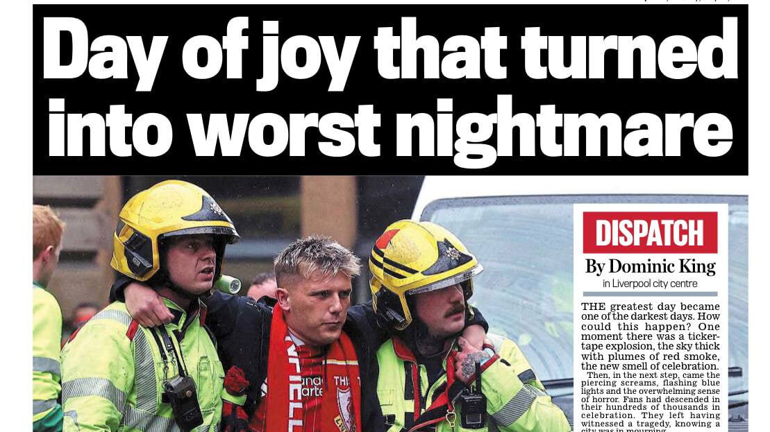 نوشتهٔ دومینیک کینگ از مرکز شهر لیورپول/ بزرگترین روز، به یکی از تاریکترین روزها تبدیل شد. چگونه ممکن است چنین اتفاقی بیفتد؟ لحظهای، آسمان مملو از انفجار نوارهای رنگی و دود سرخ بود و بوی جشن و شادی در فضا پیچیده بود بوی تازهٔ جشن و شادی پیچیده بود.