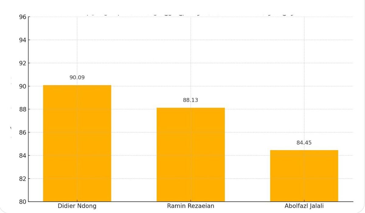 در جایگاه سوم، جلالی قرار میگیرد. بازیکنی که شاید در نگاه اول کمسروصدا باشد، اما عملکردش در بازیخوانی و پوشش فضاها، اغلب مانع از پیشروی تیمهای حریف شده است. او با پاسهای کوتاه هدفمند و مشارکت مؤثر در انتقال توپ، به نقطه اتکای فنی کادر مربیگری بدل شده—اگرچه کمتر به چشم آمده، اما آمار خلاف این سکوت را نشان میدهد.
