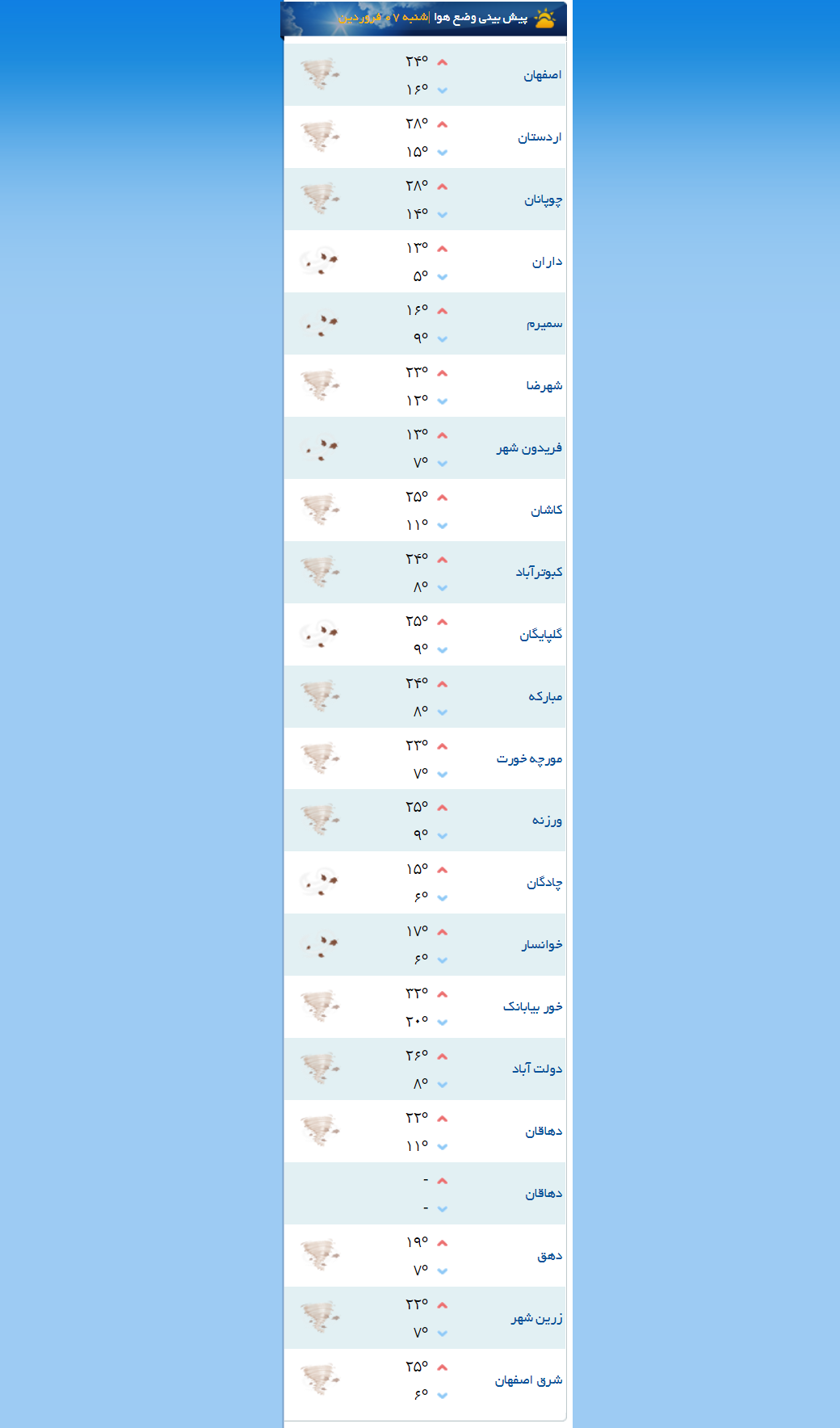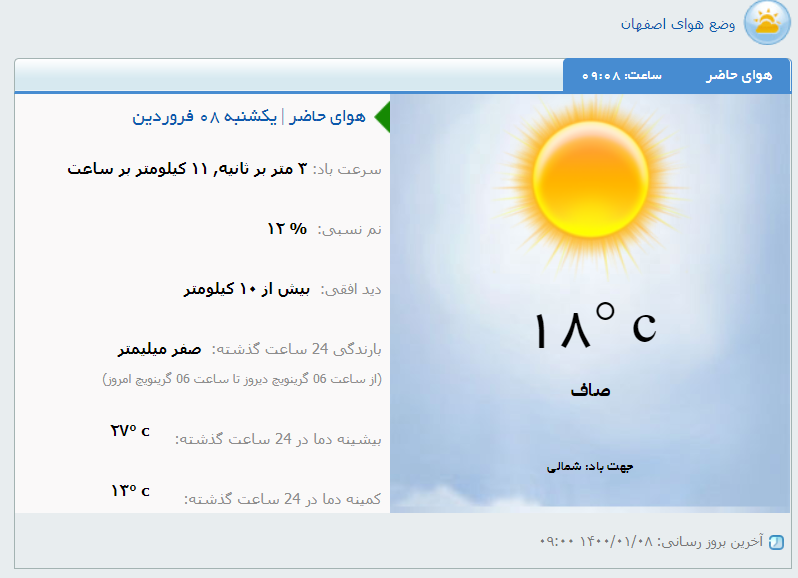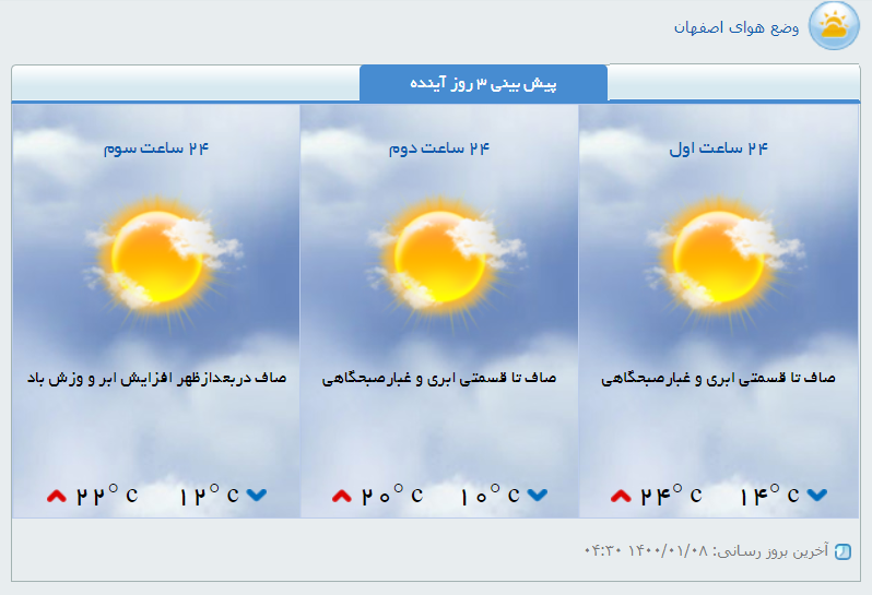 بر اساس این گزارش هوای کلانشهر اصفهان امروز یکشنبه صاف تا قسمتی ابری و غبارصبحگاهی؛ گاهی وزش باد به نسبت شدید و احتمال گرد و خاک محلی و برای فردا دوشنبه صاف تا قسمتی ابری و غبارصبحگاهی گاهی وزش باد پیش بینی میشود.
