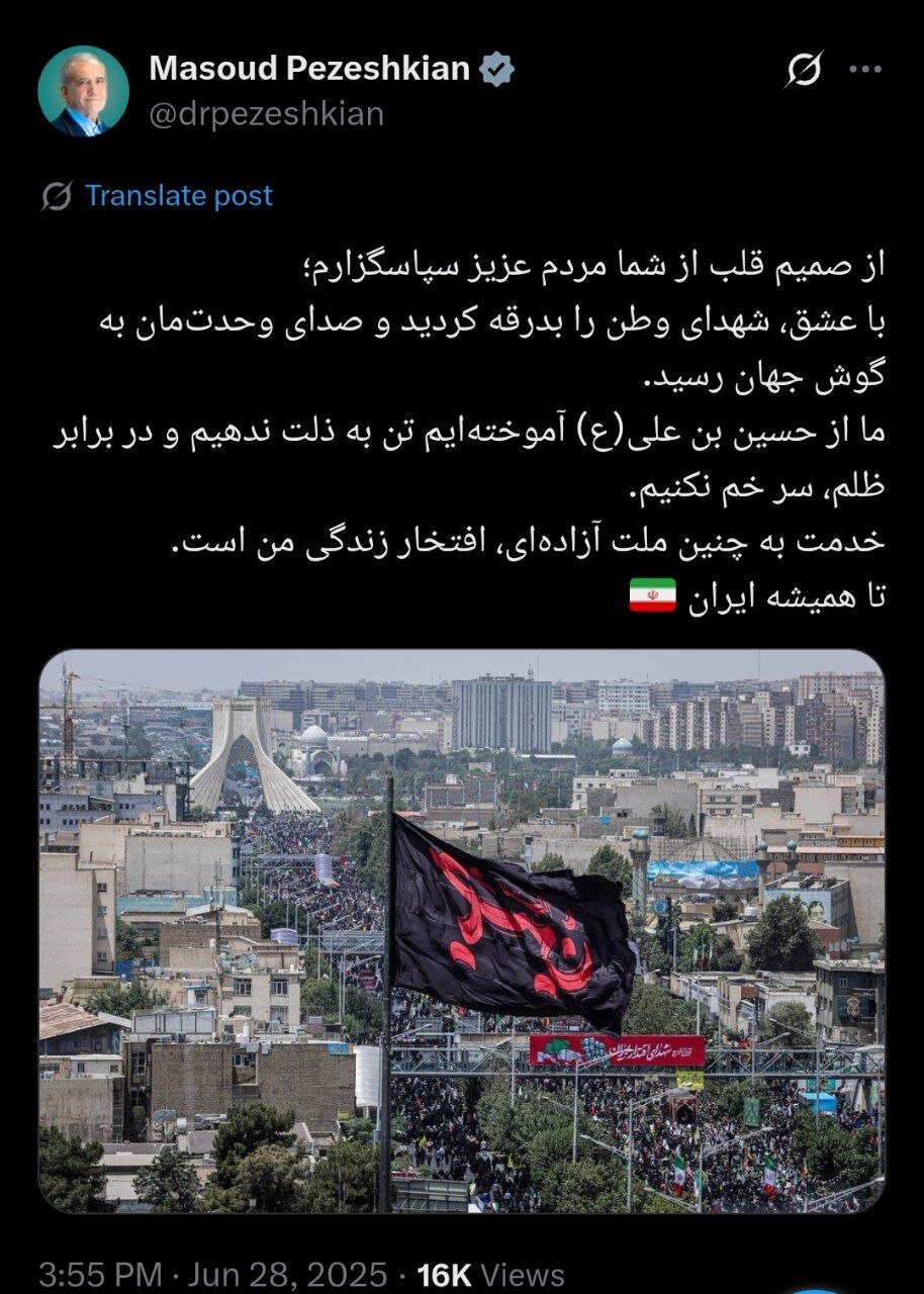 به گزارش خبرگزاری مهر، مسعود پزشکیان رئیس جمهور در شبکه اجتماعی ایکس با انتشار تصویری از حضور مردم در مراسم تشییع پیکر ۶۰ شهید اقتدار ایران نوشت: از صمیم قلب از شما مردم عزیز سپاسگزارم؛ با عشق، شهدای وطن را بدرقه کردید و صدای وحدتمان به گوش جهان رسید.
