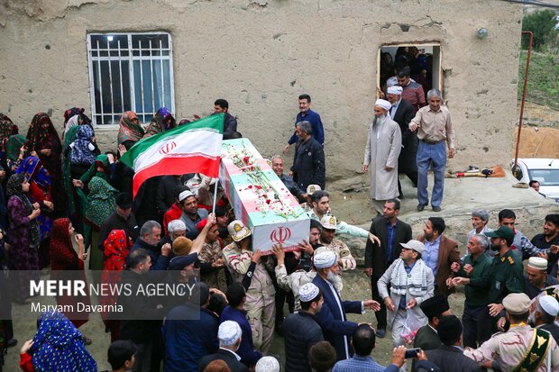 بجنورد- پیکر شهید (حامد ربانی) که بر اثر حملات رژیم صهیونیستی در بندرعباس به شهادت رسیده بود بر روی دوش مردم قدرشناس راز و جرگلان تشییع شد.