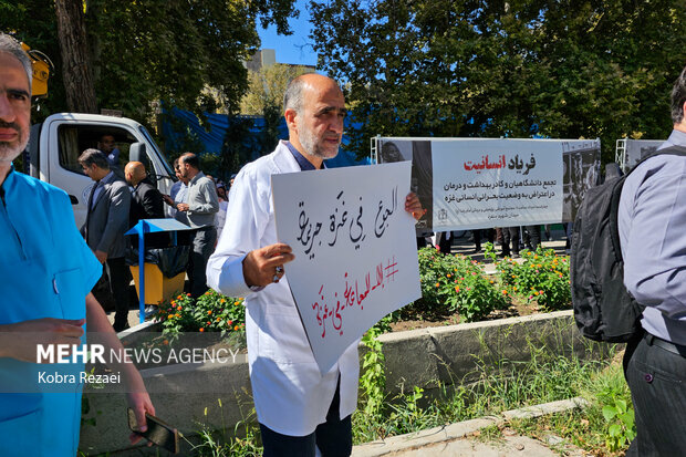 مشهد - تجمع «فریاد انسانیت» با حضور کادر درمان دانشگاه علوم پزشکی مشهد در حمایت از مردم مظلوم غزه در بیمارستان امام رضا (ع) مشهد برگزار شد.