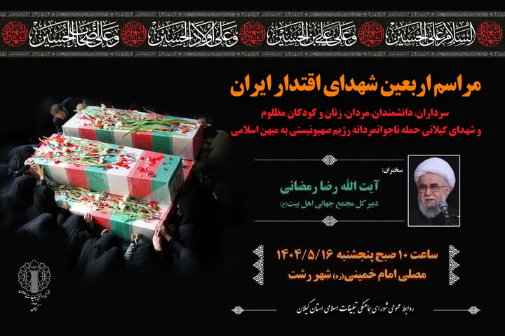 در آستانه اربعین حسینی و تجلی شور و شعور عاشقان اهل بیت (ع)، مراسم محوری اربعین شهدای اقتدار ایران (سرداران سرافراز، دانشمندان بصیر، مردان و زنان مقاوم، کودکان بیگناه و شهدای مظلوم گیلانیِ حمله ناجوانمردانه و ددمنشانه رژیم نامشروع و جنایتکار صهیونیستی به میهن اسلامی)، ساعت ۱۰ صبح پنجشنبه ۱۶ مرداد در مصلی امام خمینی (ره) شهر رشت با سخنرانی آیتالله رضا رمضانی، دبیرکل مجمع جهانی اهل بیت (ع) برگزار میگردد.
