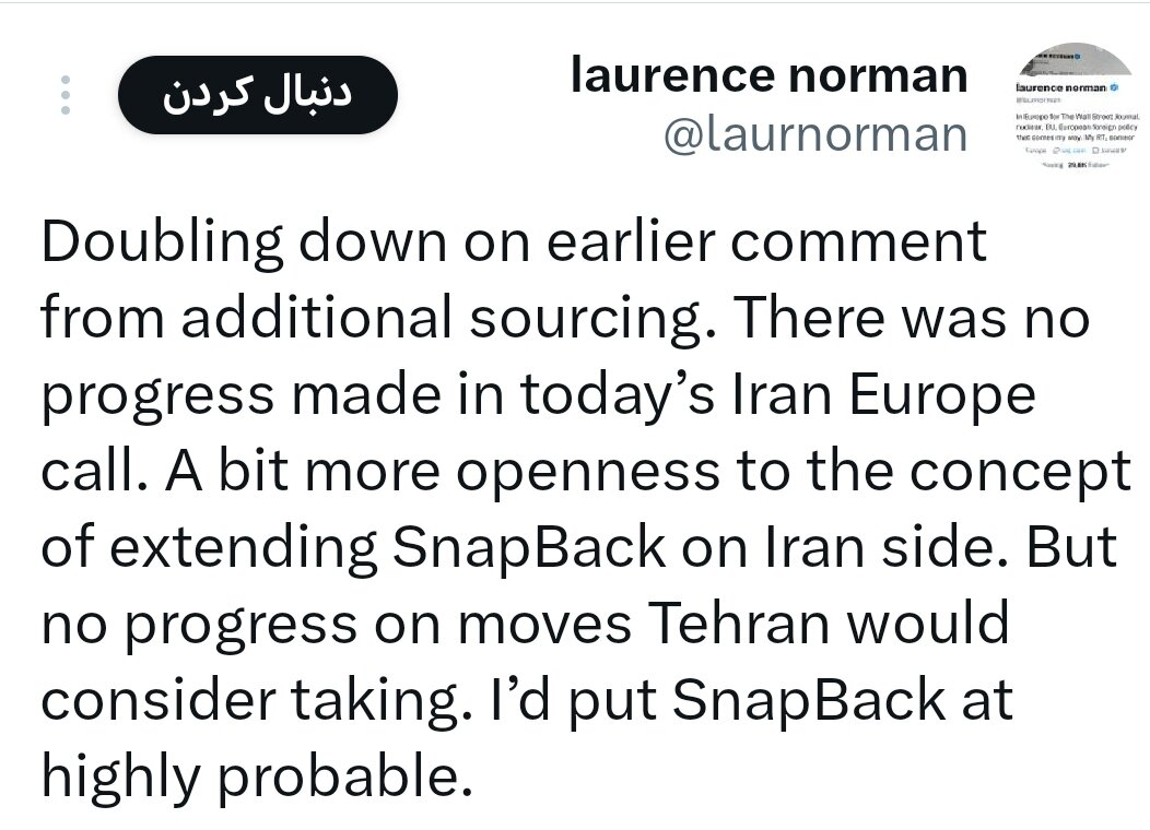 به گزارش همشهری آلاین لارنس نورمن خبرنگار وال استریت ژورنال در شبکه اجتماعی ایکس نوشت: در تماس امروز ایران و اروپا هیچ پیشرفتی حاصل نشد. اندکی گشایش نسبت به ایده تمدید اسنپبک از سوی ایران دیده شد، اما هیچ پیشرفتی در اقداماتی که تهران ممکن است به آنها تن دهد به دست نیامد. من احتمال فعال شدن اسنپبک را بسیار بالا میدانم.