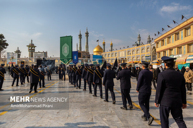دسته خادمان حرم مطهر حضرت معصومه (س) نیز همچون سالهای گذشته از مسجد امام حسن عسکری (ع) حرکت کرده و با ورود به حرم مطهر، در آئینی نمادین مصیبت شهادت امام رضا (ع) را به خواهر گرامی ایشان تسلیت گفتند.