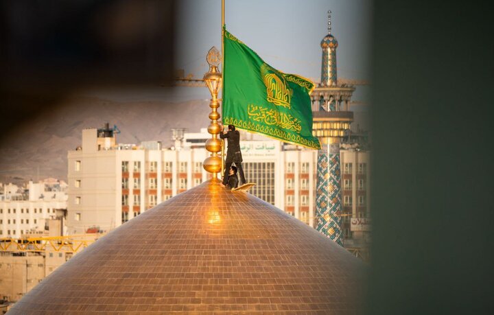 مشهد- پس از ۶۳ روز سیاه پوشی و عزاداری محرم و صفر و ایام شهادت امام رضا (ع)، در طلوع سومین روز ماه ربیع الاول پرچم مشکی گنبد مطهر و کتیبههای عزاداری تعویض شد.