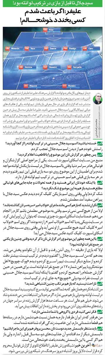 علیرضا علیفر که گزارش این مسابقه را بر عهده داشت، در لحظات ابتدایی این مسابقه از جلال حسینی کاپیتان اسبق پرسپولیس و تیم ملی به عنوان یکی از هافبکهای لوانته یاد کرد! سخنی که بازتاب رسانهای بسیار وسیعی پیدا کرد و سر و صدای زیادی داشت.