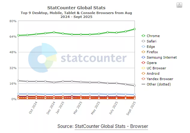 طبق گزارش ماه سپتامبر StatCounter، سهم گوگل کروم در بازار مرورگرها به رکورد بیسابقه 71.86 درصد رسیده است. سهم کروم طی دو ماه اخیر چندین درصد افزایش پیدا کرده و در مقابل سافاری شاهد افت جزئی سهم خود بوده است.