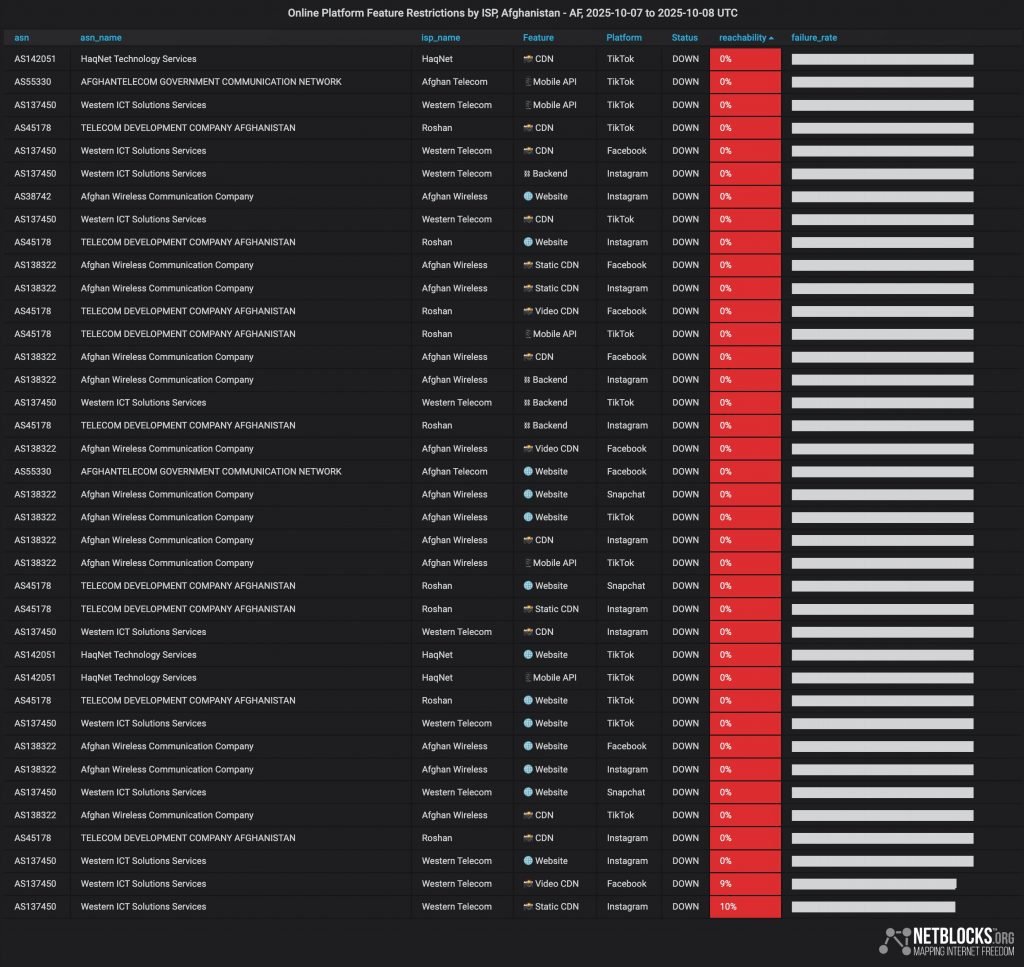 براساس دادههای منتشر شده توسط نت بلاکس و گزارشهای محلی، دسترسی به شبکههای اجتماعی محبوب مانند اینستاگرام، فیسبوک، اسنپچت و تیکتاک در افغانستان توسط چندین ارائهدهنده خدمات اینترنتی از جمله افغانوایرلس، روشن، حقنت و وسترن تلکام به طور گسترده محدود شده است.
