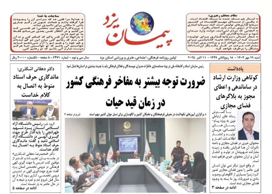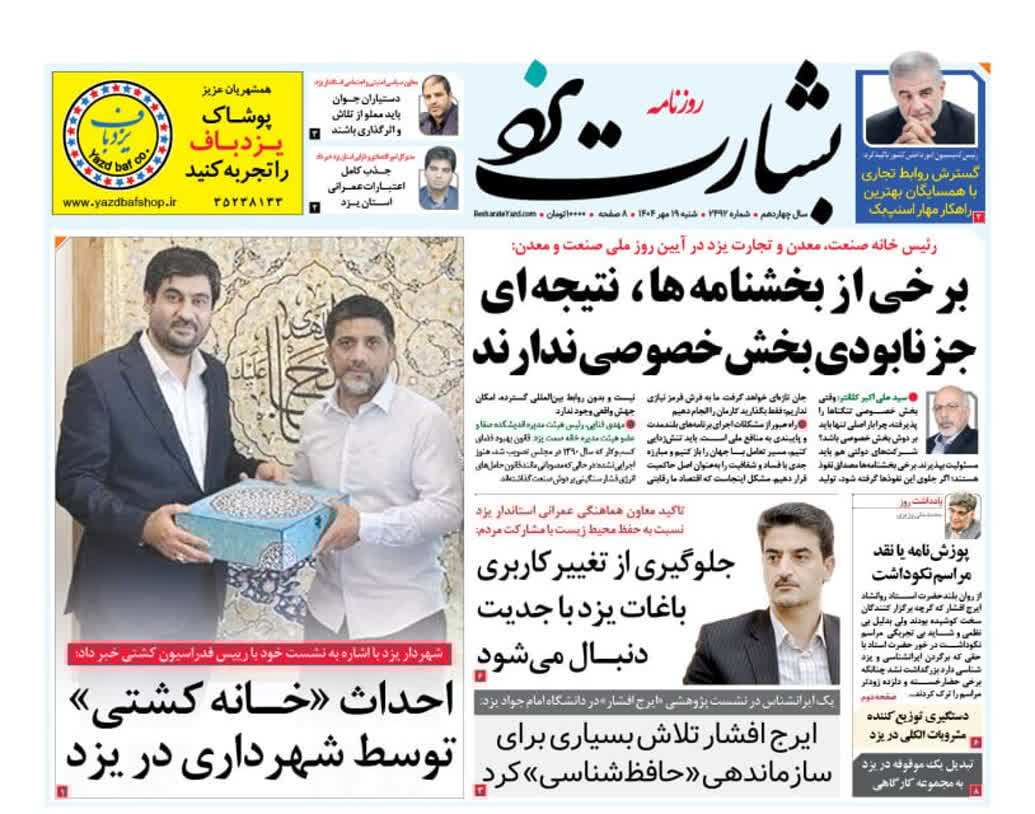 صفحه نخست روزنامه‌های یزد شنبه ۱۹ مهر